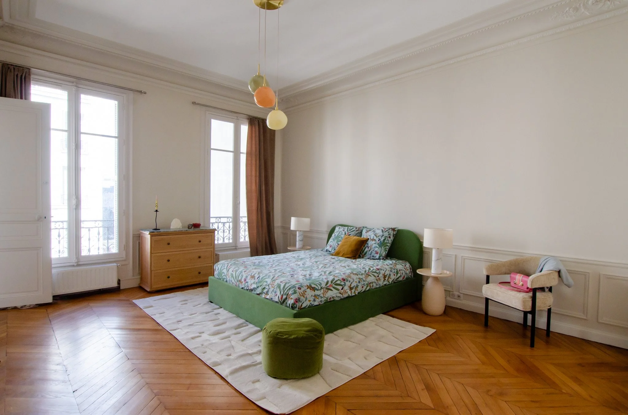 Transformation raffinée d’un appartement de 250m2 situé avenue Victor Hugo Paris 16 ème, axée sur des tons boisés et colorés. L’équilibre du vert apporte aux chambres un ton printanier et les notes de rose une douceur dans les pièces de vie.